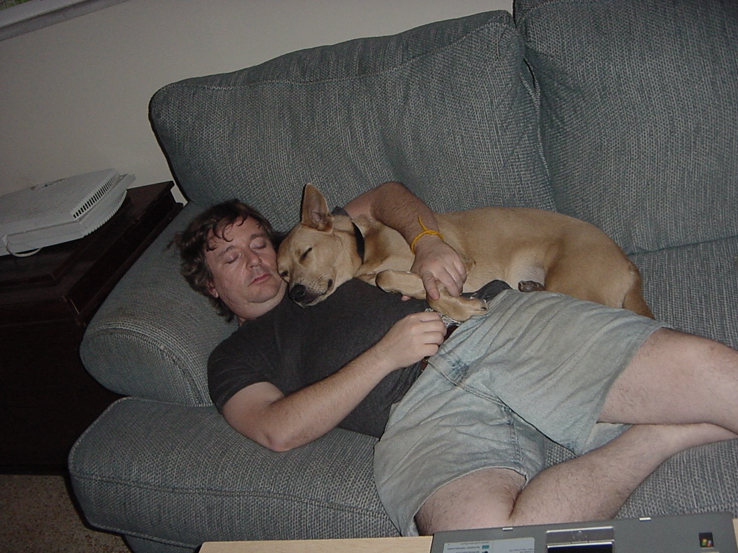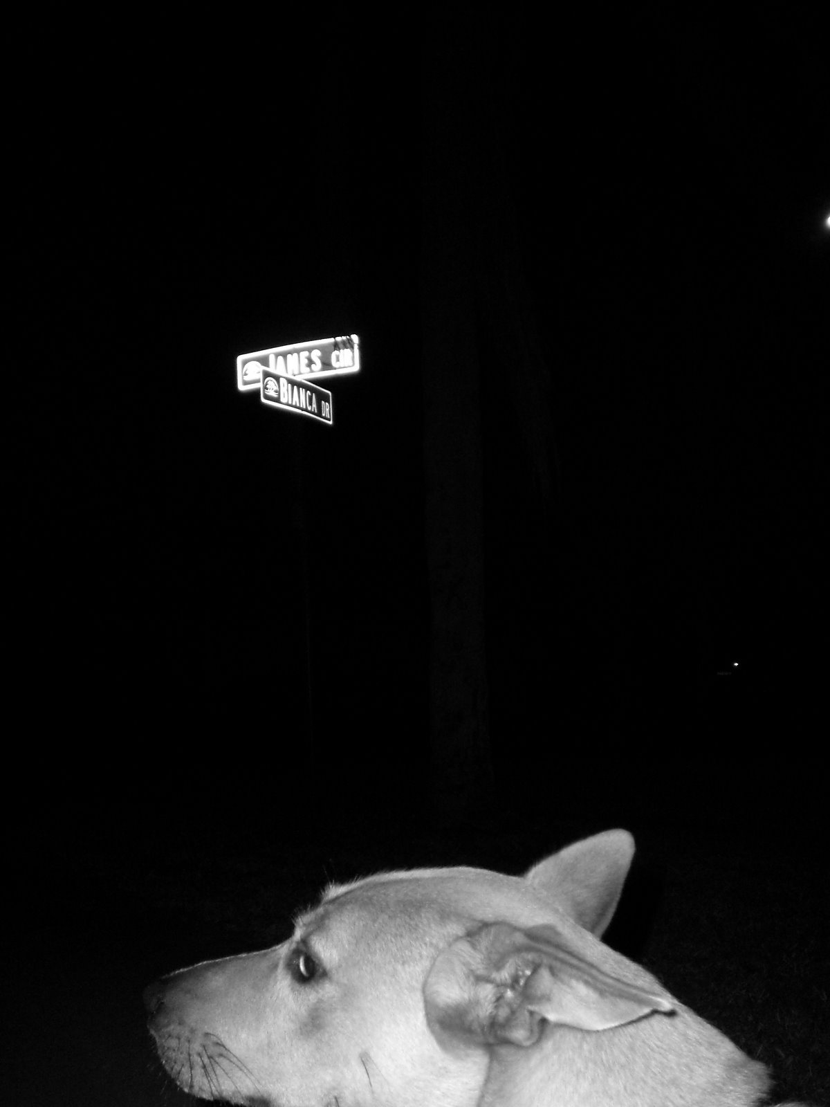 We grabbed a leash and opened the door. She sat there. We put the leash around her neck and she sat looking up at us. Silent. It seemed she wanted to be carried. She, already a bit too big for that, I, bending at the knees because I do love the sound of creaking so, we walked out to the yard—a father carrying his too-large child. Once there, once down, she walked by my side. When I ran she trotted right with me until I found myself on my back, flat, staring at the sky,head slightly ringing, my leash-arm straight behind me. Fawn-coloured eight-month-old unidentified walked over and stared into my face. Apparently, she had decided to stop mid-trot and have a liedown. At the door in from the yard, she stopped to be carried again and looked with disdain at the other dogs. Never a sound.